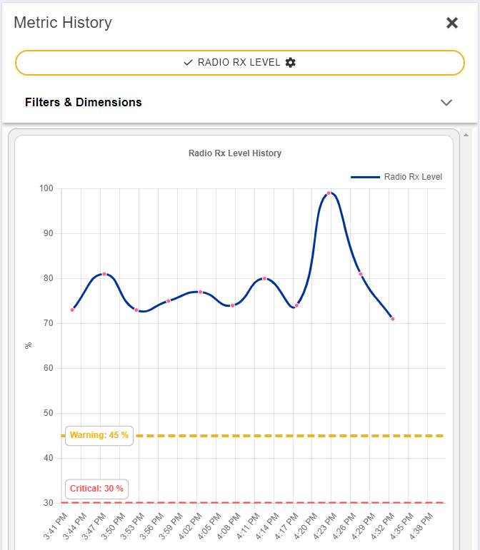 The health metric displayed will default to the Console/Sign health metric badge you selected above, over a time period of 1 hour. Warning and Critical levels will be indicated.